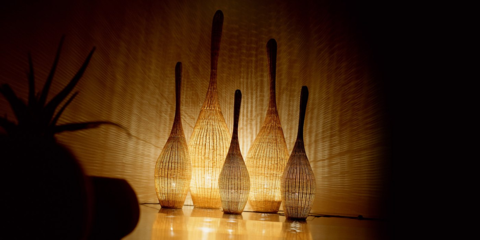 На фото: серия напольных светильников из плетеного волокна Gervasoni Bolla.