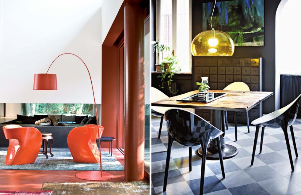 На фото: лакированное дизайнерское кресло, выполненное из цветного пластика Moroso Little Albert и стул Kartell Super Impossible авторства Филиппа Старка.