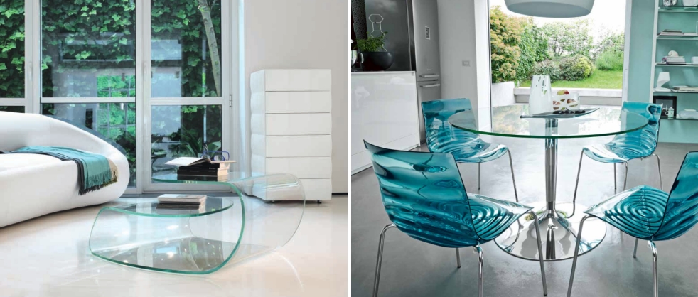 На фото: журнальный столик Tonin Casa Volup, дизайнерские стулья Connubia L’eau.
