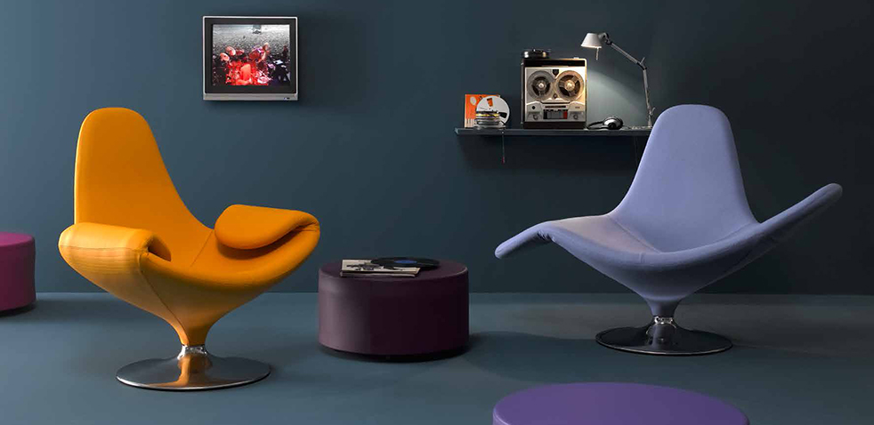 Такое яркое кресло с регулируемыми подлокотниками отлично впишется в интерьер в стиле эпохи 60-х.