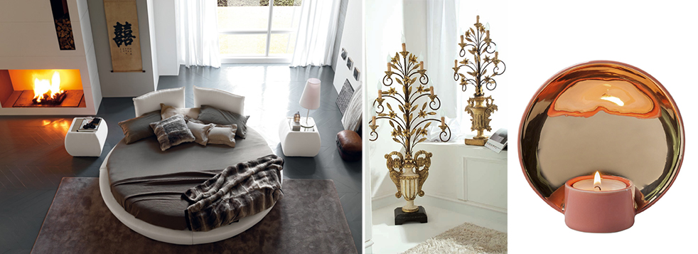 На фото: круглая кровать Bolzan Miami, светильник Silvano Grifoni, оригинальный подсвечник Bosa.