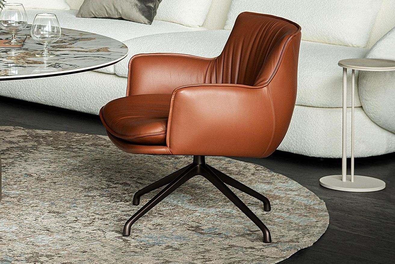 На фото: вращающийся стул Cattelan Italia Rhonda Lounge с изящным изгибом спинки. Элегантность, практичность и выразительная простота делают Rhonda универсальным решением для современных интерьеров.