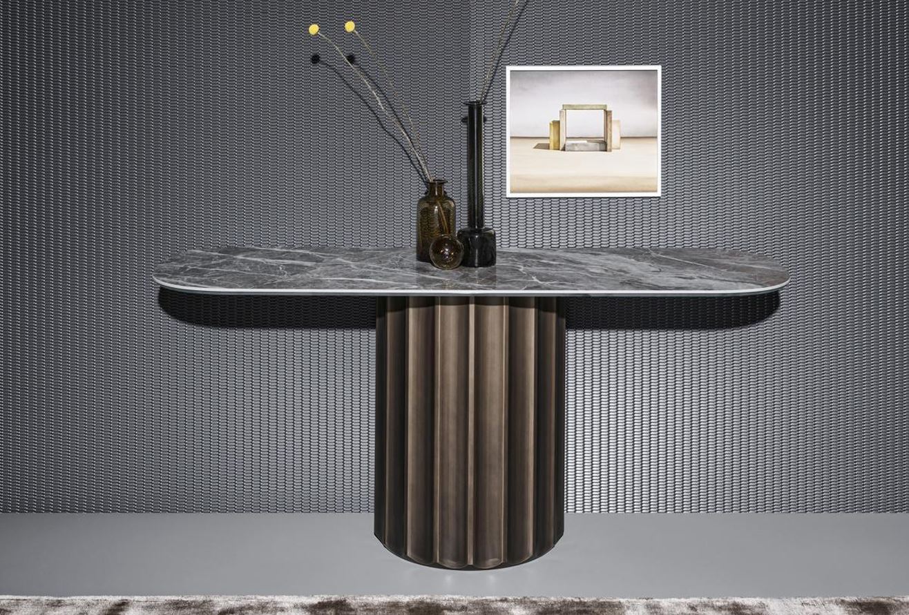 Основание консоли Dorian с рельефной текстурой напоминает античные колонны. Там, где когда-то была капитель, теперь — изящная столешница из мрамора. Контраст между монументальностью основания и лёгкостью верхней плоскости создаёт эффектный визуальный акцент в прихожей или гостиной: