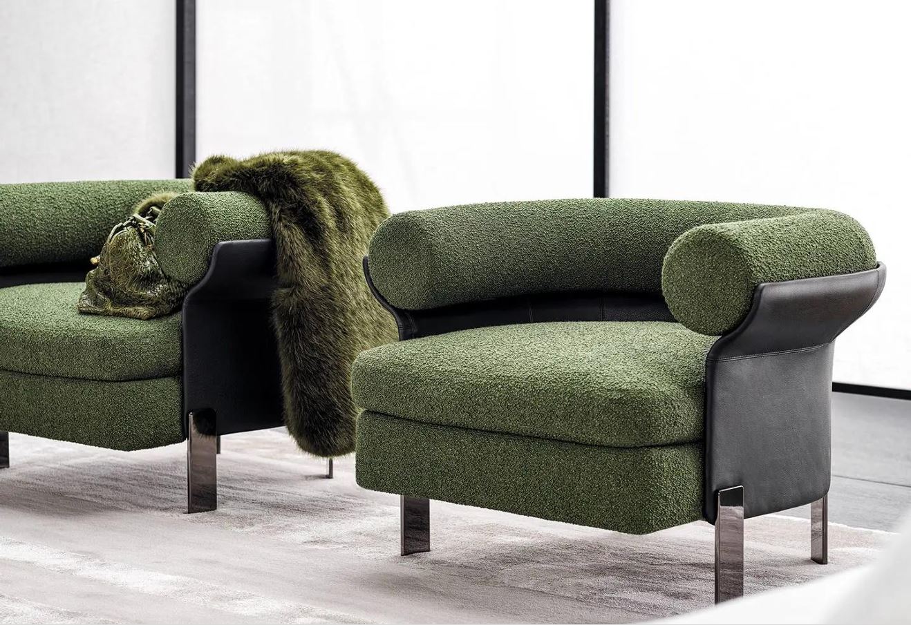 Кресло Mattia создаёт похожий эффект уюта, но за счёт совершенно иного подхода. Его форма вдохновлена архитектурой. Контраст между жёстким внешним каркасом, раскрывающимся словно бутон, и подвешенной цилиндрической спинкой рождает современную интерпретацию дизайна 70-х. Ткань Orangerie из шерсти и вискозы в насыщенно-зелёном оттенке символизирует спокойствие и уверенность.