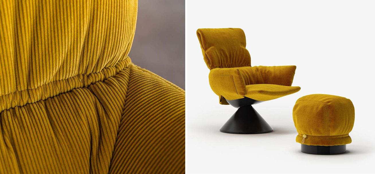 На фото: кресло Lud’o Lounge от итальянской фабрики Cappellini. Стёганая обивка доступна в ассортименте тканей и кожи из коллекции. Полностью изготовлено из переработанных материалов и подлежит повторной переработке.