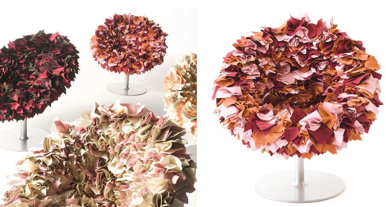 Стул Bouquet — одно из самых трогательных творений Токудзина Йошиоки, японского мастера, который превращает повседневные материалы в нечто волшебное. Изящная форма будто распускается на тонком хромированном «стебле». Внутреннюю поверхность мягкой чаши полностью покрывают сотни аккуратно сложенных вручную квадратиков ткани, похожих на лепестки или осенние листья.