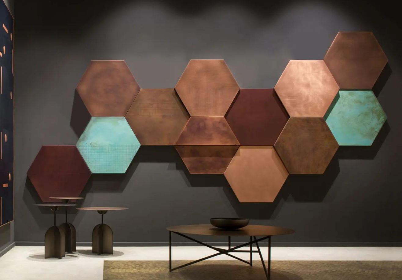 Металл, меняющий цвет как осенняя листва. В коллекции DecoDe компания De Castelli использует уникальные технологии окисления, текстурирования и гравировки, превращая металл в живой материал, взаимодействующий с пространством. Гексагональные панели не только декоративны, но и хорошо поглощают шум.