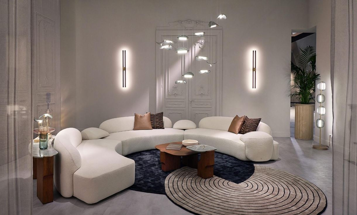 Органичные формы — одно из самых устойчивых направлений последних лет. Но тенденция меняется: если раньше плавные линии были скорее декоративным жестом, то сейчас они становятся полноценной архитектурной логикой. Закруглённые диваны и модули позволяют зонировать пространство без перегородок, кухонные острова приобретают скульптурные очертания, дверные проёмы стремятся к арочным силуэтам.