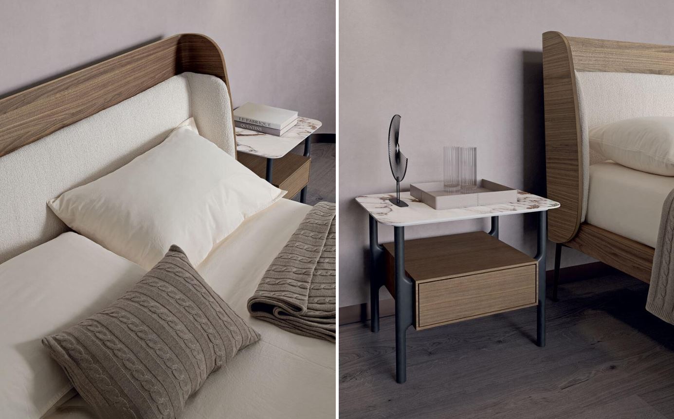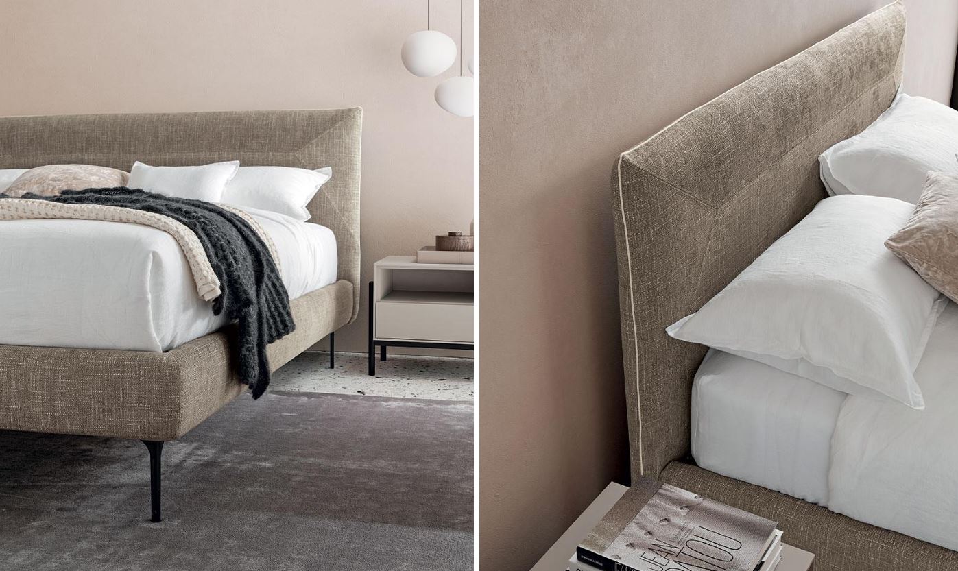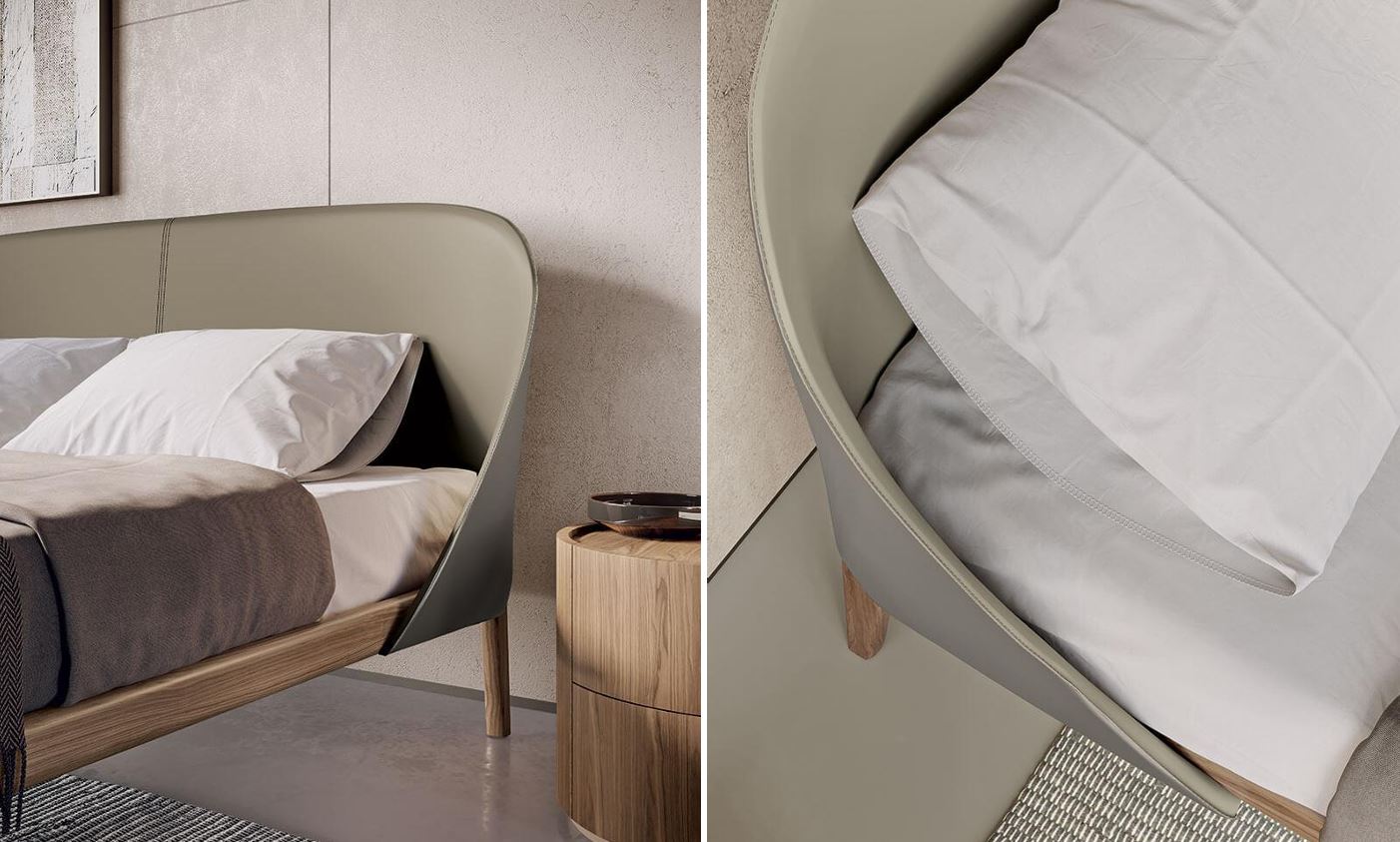 На фото: Volume — деревянная двуспальная кровать, доступная в различных вариантах отделки. Её современный дизайн может быть дополнен подушкой, которая вставляется в форму изголовья и обтягивается тканью, экокожей или кожей, всегда со съёмными чехлами. Основание опирается на трубчатые металлические ножки или доступно в версии с ящиком для хранения.
