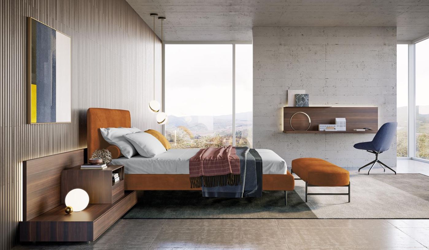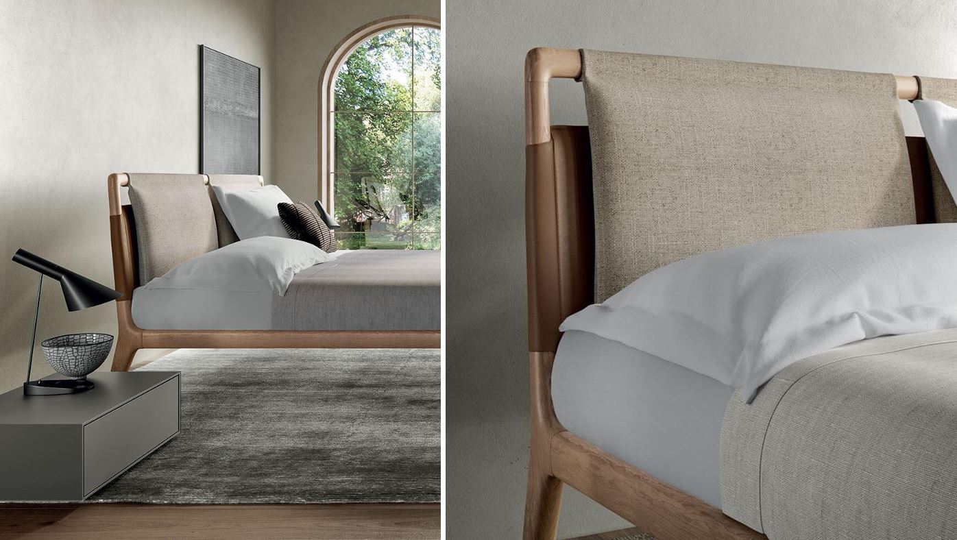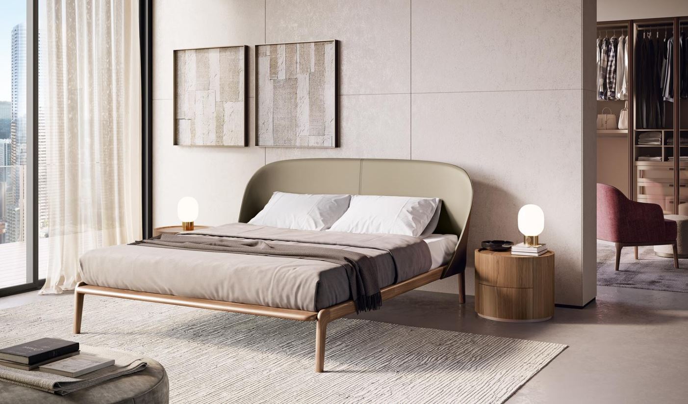 На фото: Volume — деревянная двуспальная кровать, доступная в различных вариантах отделки. Её современный дизайн может быть дополнен подушкой, которая вставляется в форму изголовья и обтягивается тканью, экокожей или кожей, всегда со съёмными чехлами. Основание опирается на трубчатые металлические ножки или доступно в версии с ящиком для хранения.