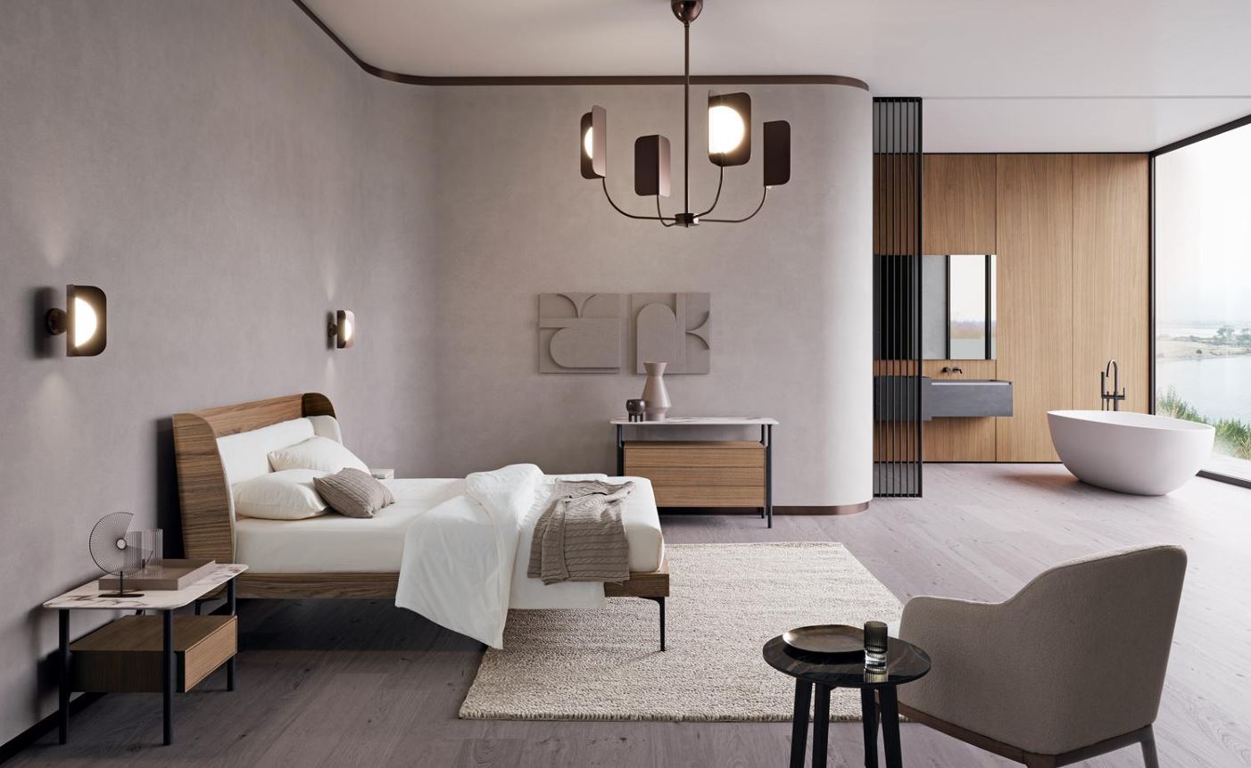 В формате master suite основную роль играют материалы и их тактильные качества — именно они формируют ощущение приватного, продуманного пространства. Орех Canaletto задаёт глубину и характер, сохраняя атмосферу уюта, даже если интерьер минималистичен. Вариант оформления — кровать Volume, тумбы Tepu, столик Zoe, кресло Gulp Lounge: