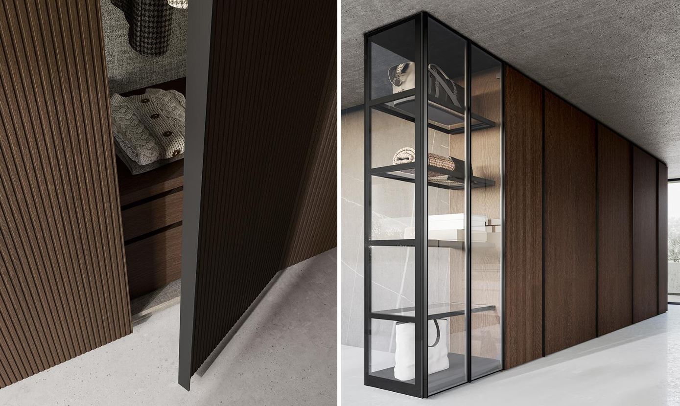 Для аутентичных интерьеров подойдёт шкаф Ritmo в технике canneté. Скульптурный рельеф создаёт уникальный эффект и делает шкаф функциональным арт-объектом. В связке с гардеробной Glass All достигается баланс ремесленной фактуры и современной эстетики.