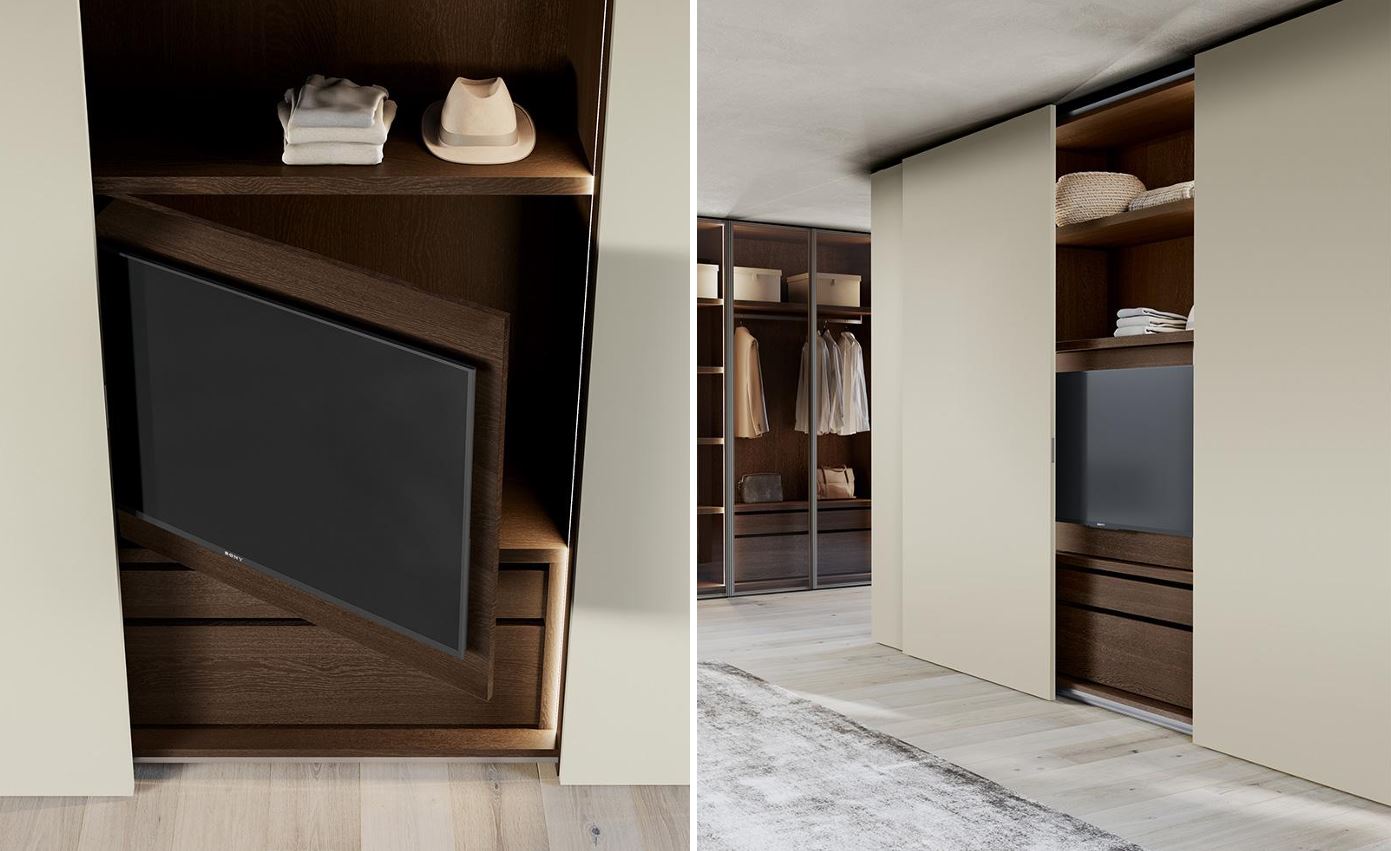 На фото: поворотный элемент для телевизора состоит из вращающейся панели, к которой крепится телевизор, и спроектирован так, чтобы идеально вписываться в шкаф. Простым движением вы можете спрятать телевизор внутри, когда он не используется.