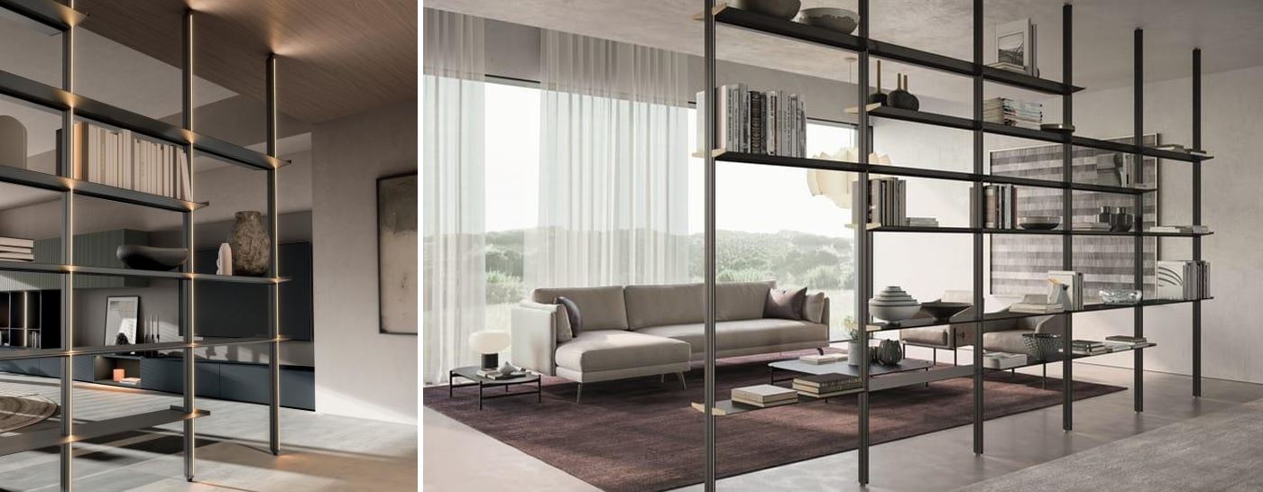Стеллаж Bamboo помогает зонировать пространство, оставаясь визуально лёгким и пропускающим свет. В сочетании с комодами Kompos, кроватью Tepu, пуфом Besu и шкафом Glass Up формируется спальня, встроенная в единый архитектурный объём.