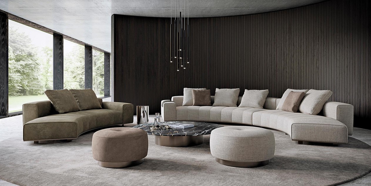 На фото: диван Minotti Goodman. Неожиданные округлые формы придают извилистую эстетику композициям, созданным вместе с линейными модулями.