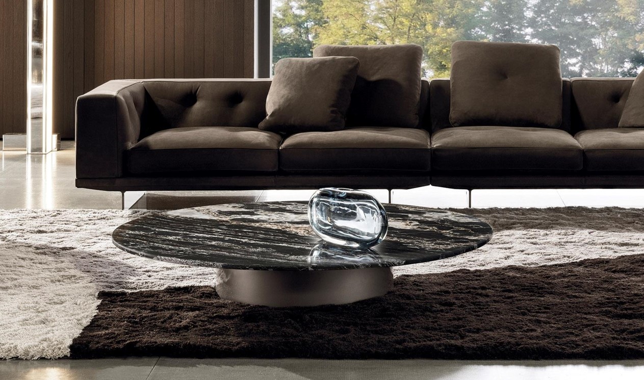 На фото: журнальный стол Minotti Doyle вдохновлён атмосферой лаунжей середины века. Круглая столешница толщиной 20 мм может быть выполнена на заказ из мрамора Calacatta, гранита Belvedere с матовой отделкой, а также из мрамора Nero Marquina и Portoro. Doyle выпускается в трёх различных размерах.
