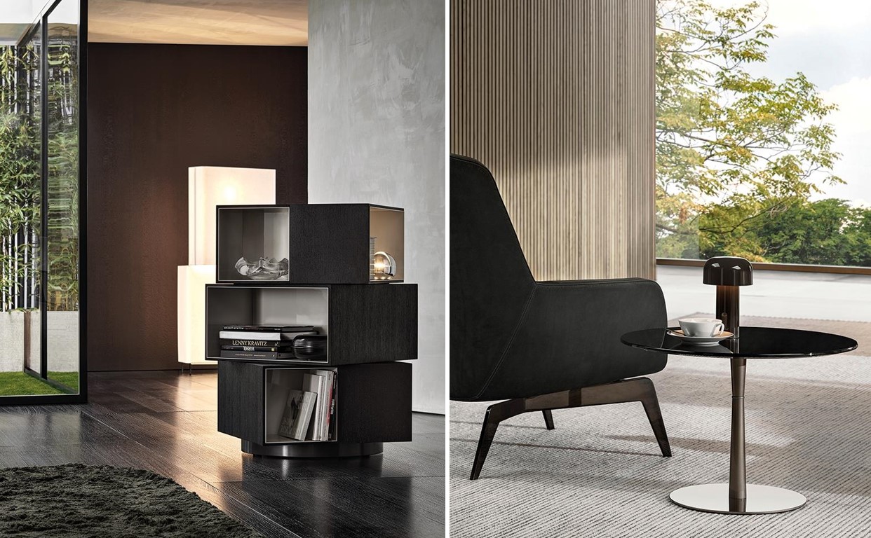 На фото: книжный шкаф Minotti Page из дерева венге, круглый столик Minotti Jigger с тонкой металлической подставкой и культовой ножкой в стиле 60-х годов.
