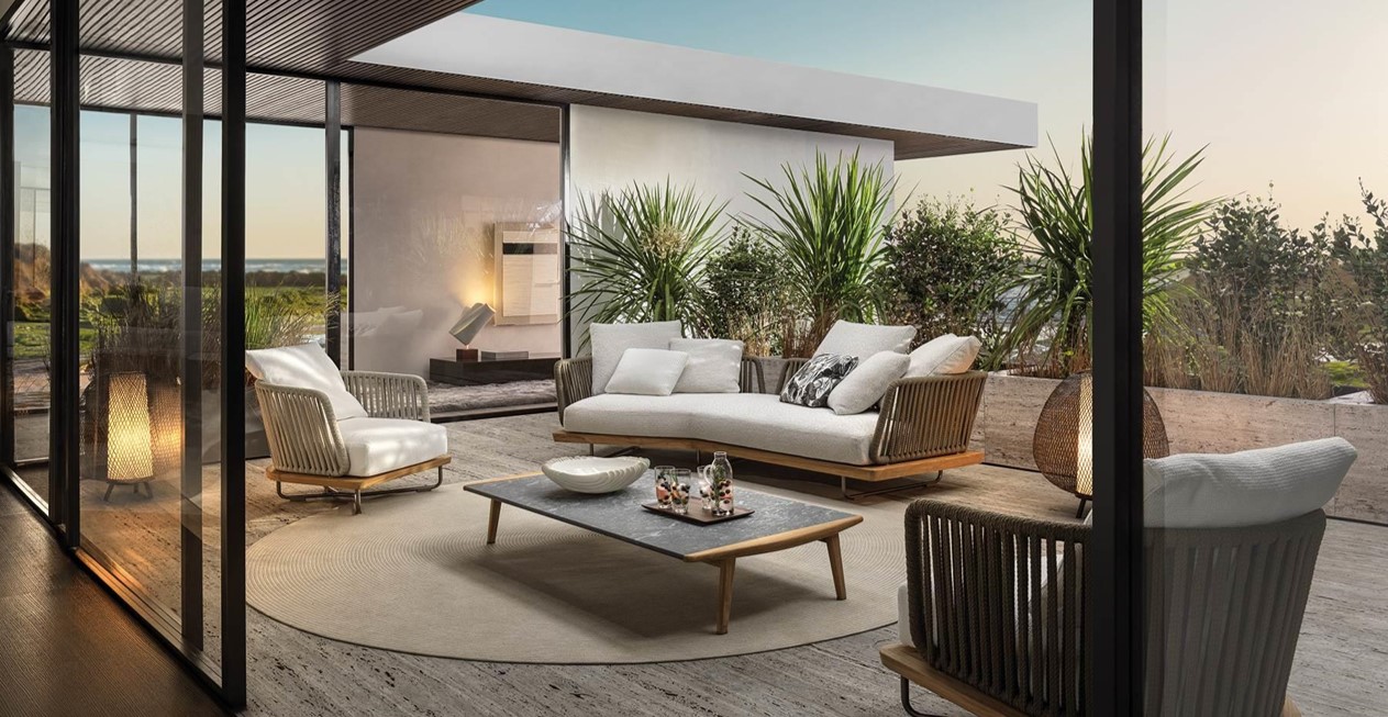 На фото: outdoor-коллекция Minotti Sunray. Поверхность из натурального тикового дерева очерчивает горизонтальную линию, а изогнутая спинка с переплетёнными шнурами придаёт динамичный вид.