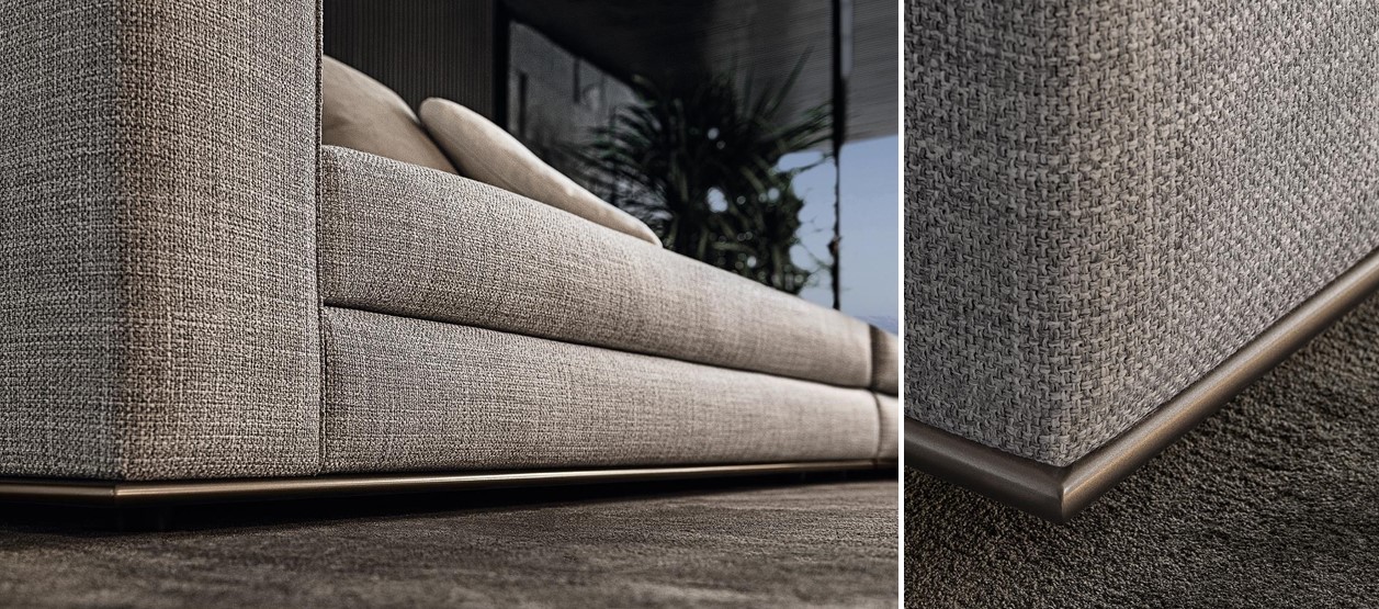 На фото: модульный диван Minotti Dylan. В исполнении с подвесным основанием, приподнятым на 13,5 см над землёй с помощью тонких ножек из экструдированного алюминия бронзового или оловянного цвета, отличается особой воздушностью.