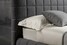 Двуспальная кровать с мягким изголовьем, выполненная в текстильной обивке.