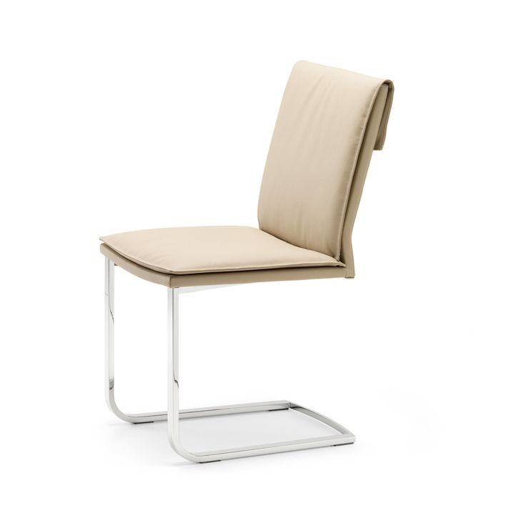 Обеденный стул с мягкой спинкой и сиденьем. Обивка выполнена из текстиля или кожи, ножки из хромированной стали.