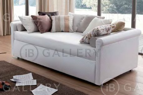 Белый диван с закругленными подлокотниками, выполненный в текстильной обивке.