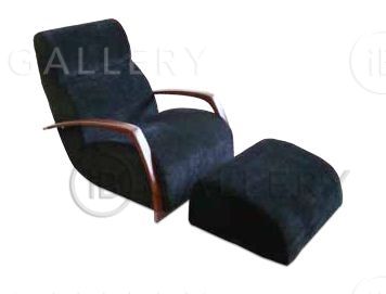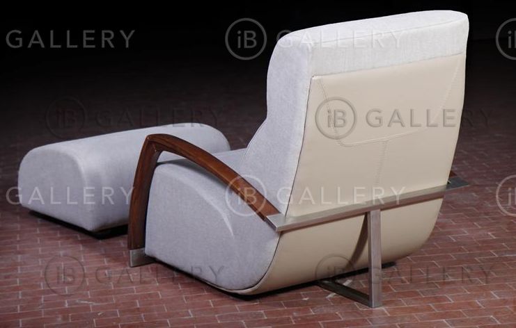 Внешняя сторона кресла и пуф выполнены в текстильной обивке (Niagara col. 46 cat. Mn), задняя часть спинки с кожаной обивкой (Chianti col. Nocciola cat. 500).