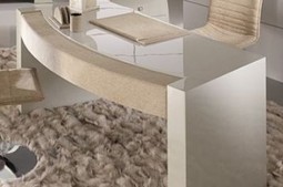 Композиция из письменного стола с закругленной столешницей, декорированного кожей, мягких стульев и кресла.