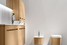 Тумба изготовлена из дуба теплого натурального оттенка, имеет встроенную фарфоровую раковину и фарфоровую столешницу.