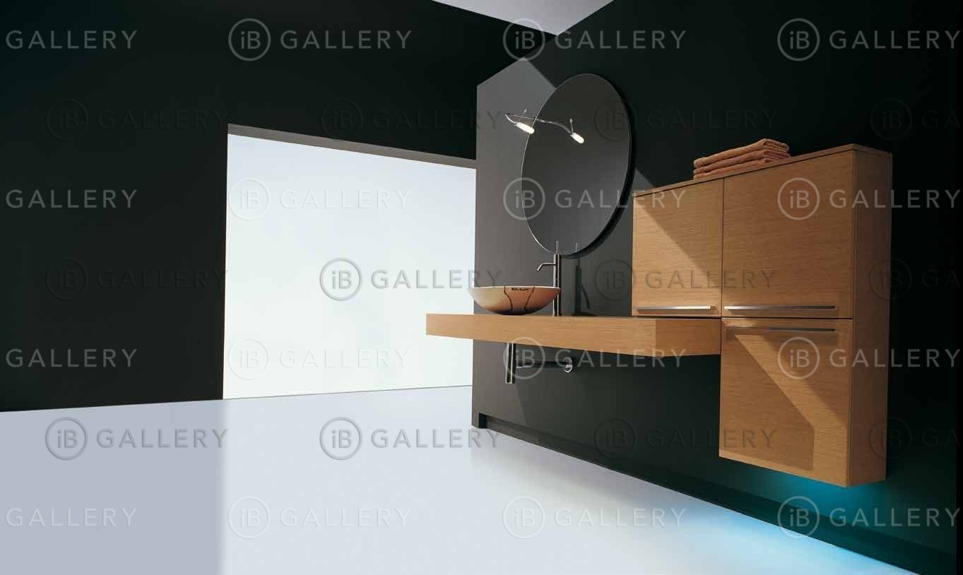 Предметы композиции: одна навесная тумба с раковиной, три навесных шкафчика, светильник и зеркало.