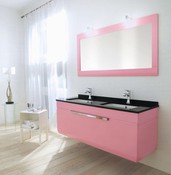 Предметы композиции: одна навесная тумба с раковиной, две полки, навесной шкаф и зеркало.