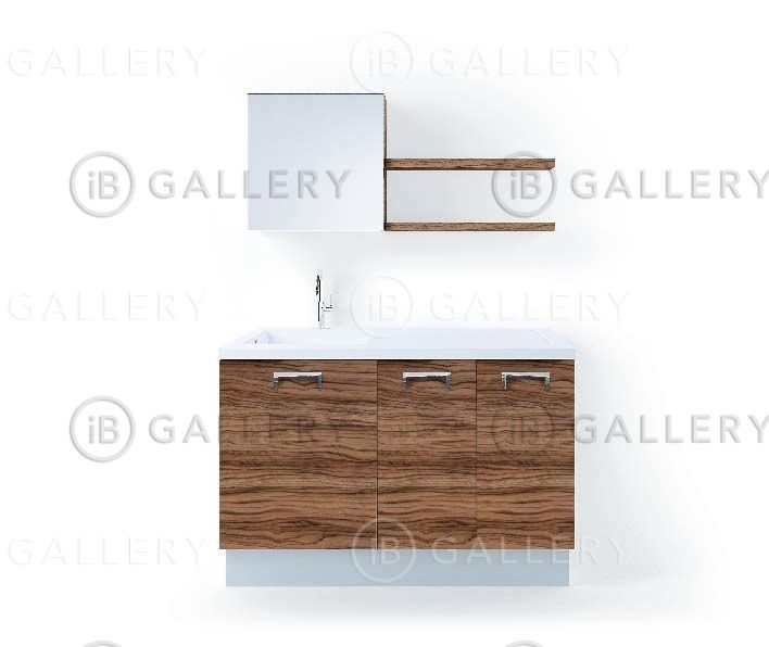 Предметы композиции: одна навесная тумба с раковиной, две открытые полки, небольшой навесной шкаф и зеркало.