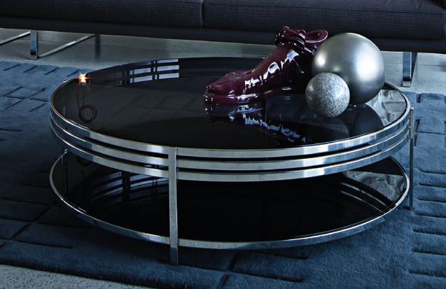 Низкий журнальный столик с круглой или прямоугольной столешницей, выполненной из стекла.