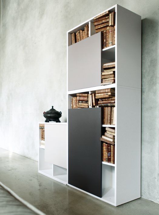 Дверца шкафа закрывает полки не полностью и оставляет их открытыми в разных углах.