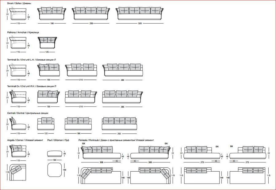 Обивка сидений и подушек спинки изготовляется из кожи или ткани, чехлы несъемные, кроме чехлов от подушек. Элементы дивана наполнены мягким гусиным пухом.