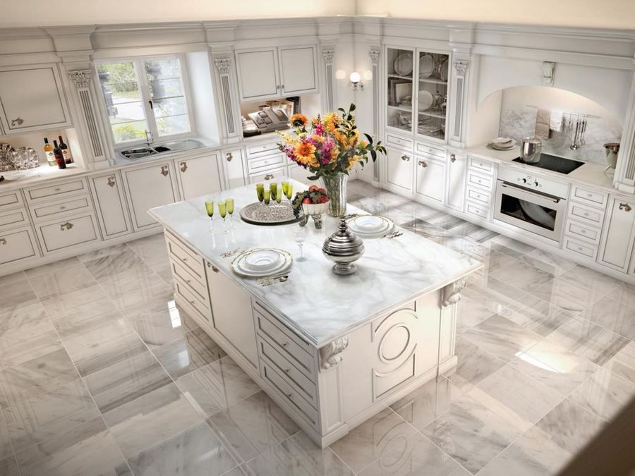 Роскошная кухня в светлых тонах выполнена из массива натурального дерева. Столешницы изготовлены из белого мрамора или на выбор из каталога производителя. Вся мебель из данного гарнитура покрыта лаком и серебром. Имеются распашные шкафчики, выдвижные ящики. Так же предусмотрено место для бытовой техники. Композицию украшают встроенные колонны, застекленные полки, стеновые (потолочные) панели и декоративные резные элементы.