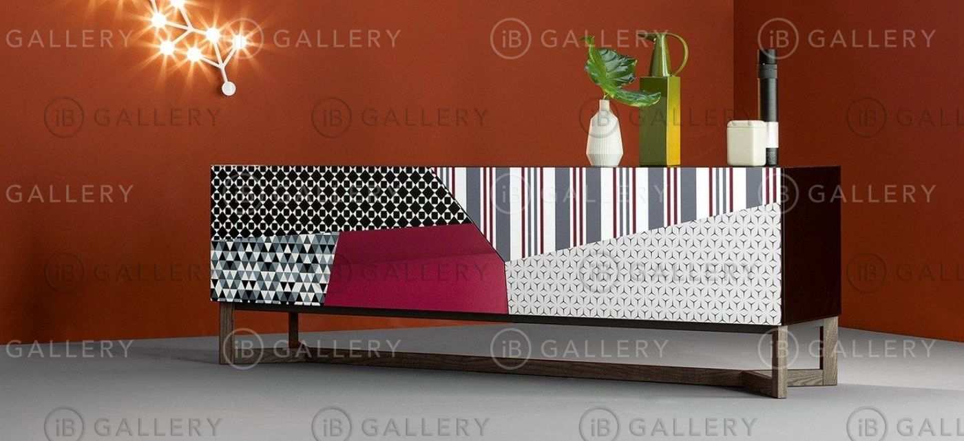 Все дверцы буфета раскрашены разными цветовыми паттернами, что создает интересный оптический эффект.