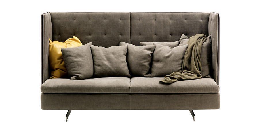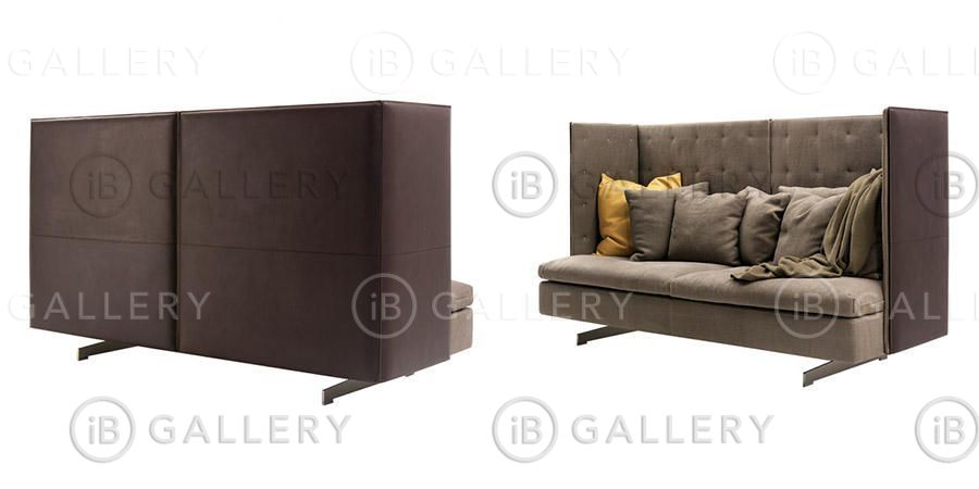 Модель обита кожей (вертикальные панели) и съёмной тканью (база и подушки).