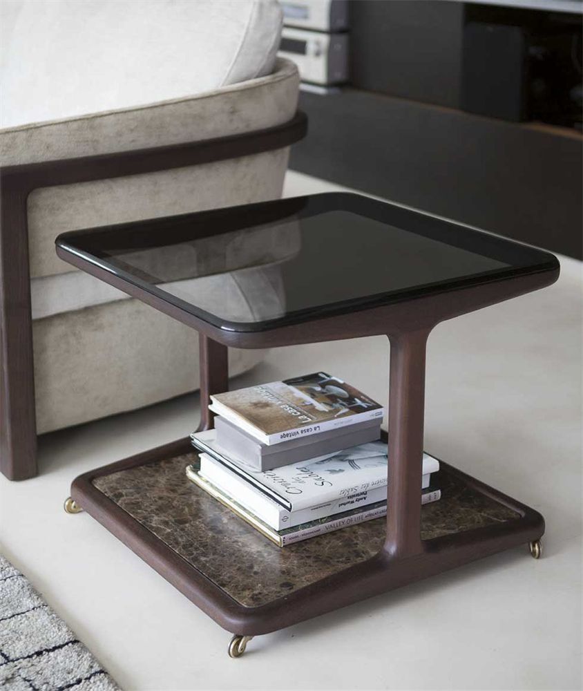 Нижняя столешница изготовлена из мрамора, верхняя - из стекла со скругленными кромками. Толщина стекла - 10 мм.