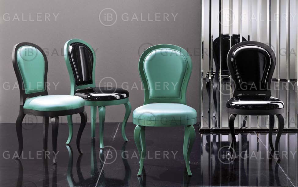 Cпинкa cтулa и cиденьe обиты искусственной кожей изумрудного цвета или лаковой чёрной кожей.