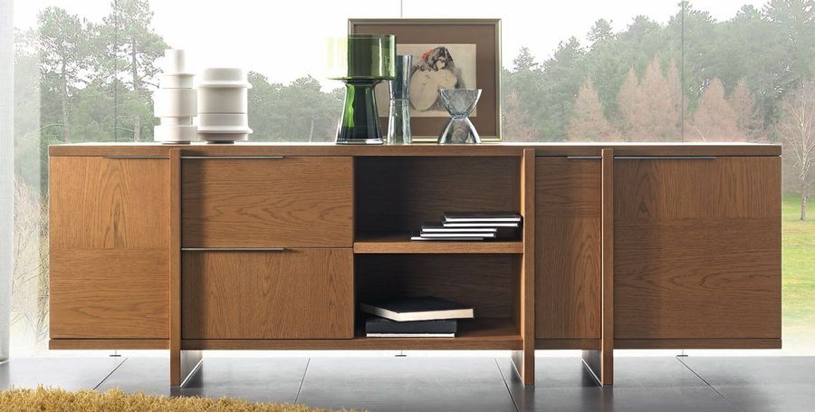 Оснащена тремя дверцами с металлическими ручками, двумя выдвижными ящиками и открытыми полками.