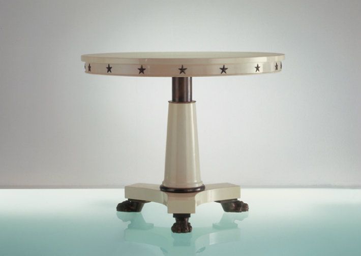 Обеденный стол с круглой столешницей, обильно декорированный деталями из бронзированной латуни: три ножки выполнены в виде лап львов, окантовка столешницы в виде пятиконечных звездочек.