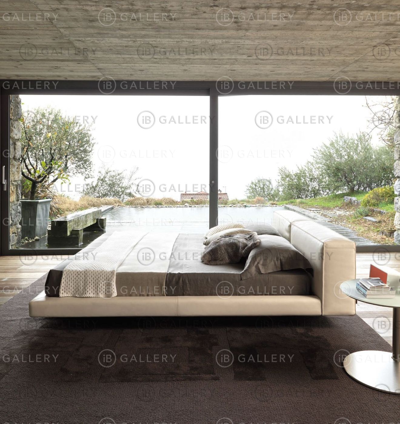Элегантная кровать на невысоких ножках. Каркас из дерева с использованием металлических деталей. Обивка из кожи или из текстиля по каталогу фабрики. Модель представлена в трех размерных вариантах.