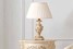 Модель имеет круглую форму. Светильник оснащён светлым абажуром. Основание, представленное в белом цвете, украшено золотистыми узорами.