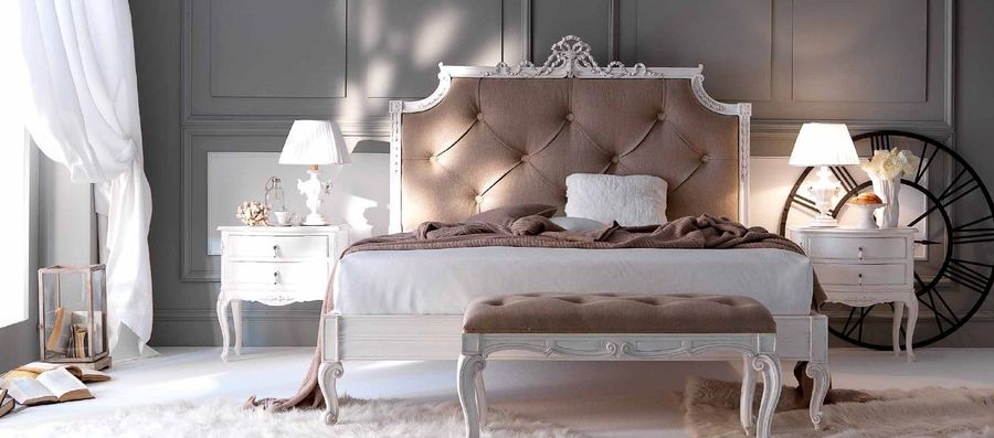 Крепкий деревянный каркас представлен в белом цвете.Модель щедро украшена декоративными элементами.