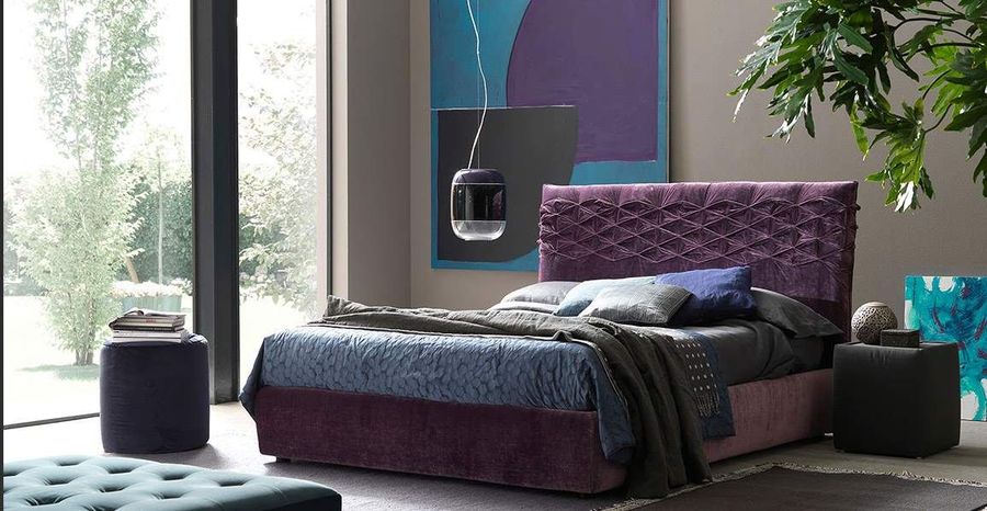 Современная двуспальная кровать. Мягкое изголовье украшено оригинальной драпировкой.