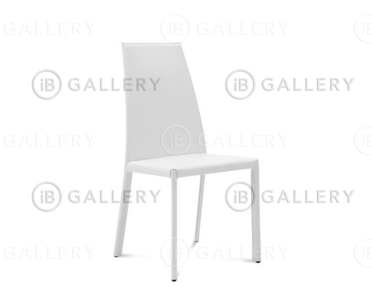 Элегантный стул на скрытом стальном каркасе. Модель полностью обита серой, белой или светло-коричневой кожей. Спинка украшена аккуратным швом.