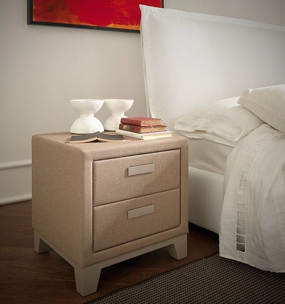 Небольшая прикроватная тумба на скрытом каркасе. Ручки и основание металлические, окраска в тон цвету корпуса. Корпус обит текстилем, ассортимент представлен в каталоге фабрики.