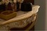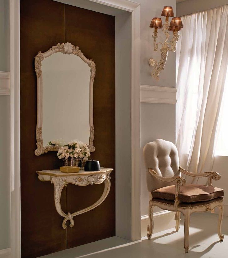 Стильная консоль украшена резьбой и позолотой. Её дизайн имеет модный эффект состаренности.