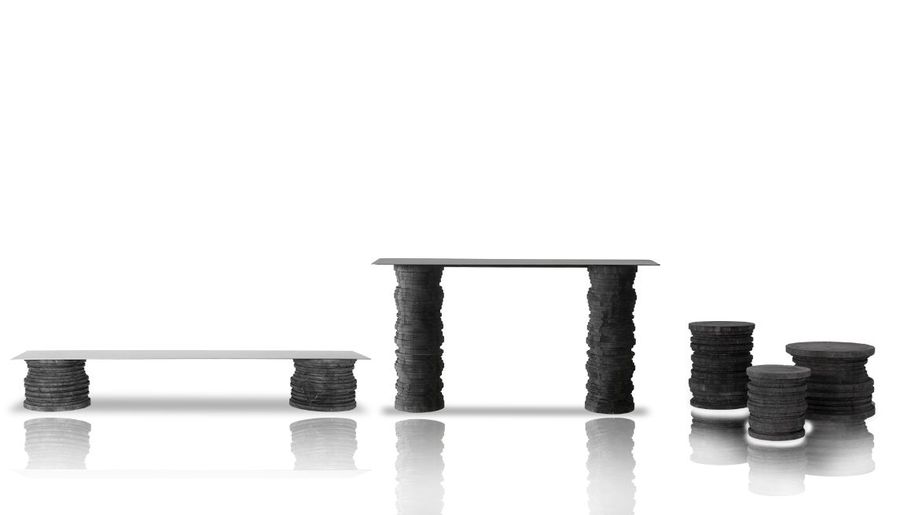 Стол изготовлен из натурального качественного дерева, ножки и стулья комплекта которого выполнены в форме срезов дерева.